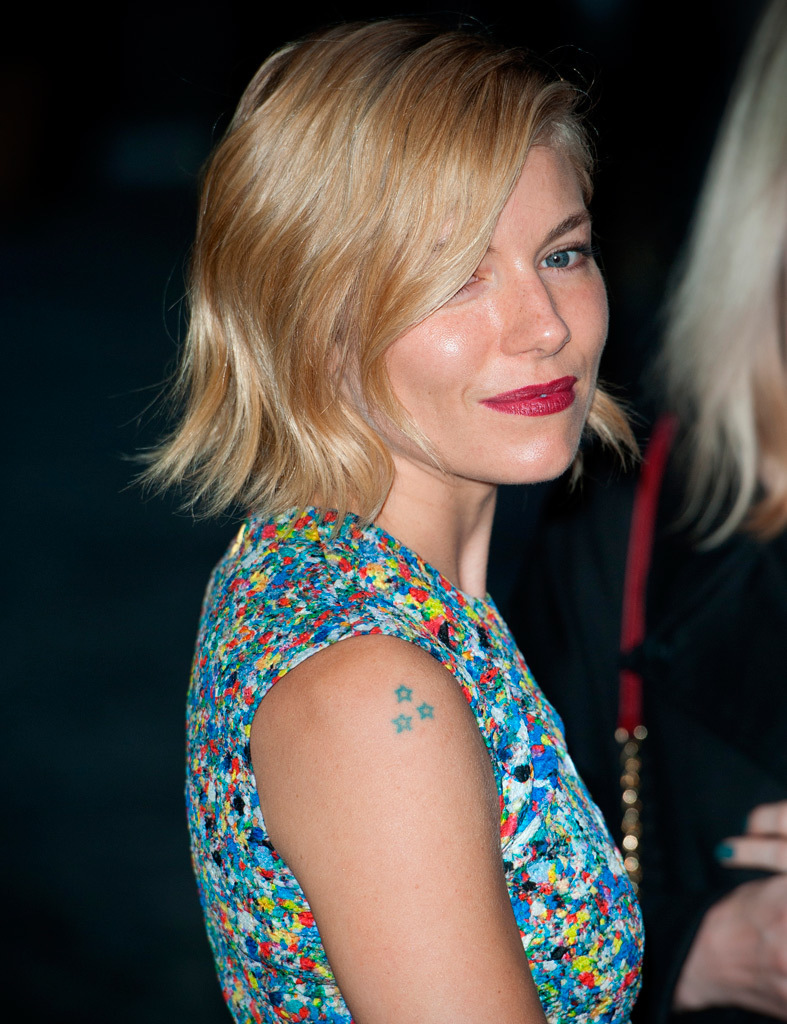 La actriz Sienna Millerluce tres pequeñas estrellas de color azul en el hombro derecho. Además de éste, tiene otros dos pequeños tatuajes: un pájaro en la muñeca y otra estrella en el estómago.