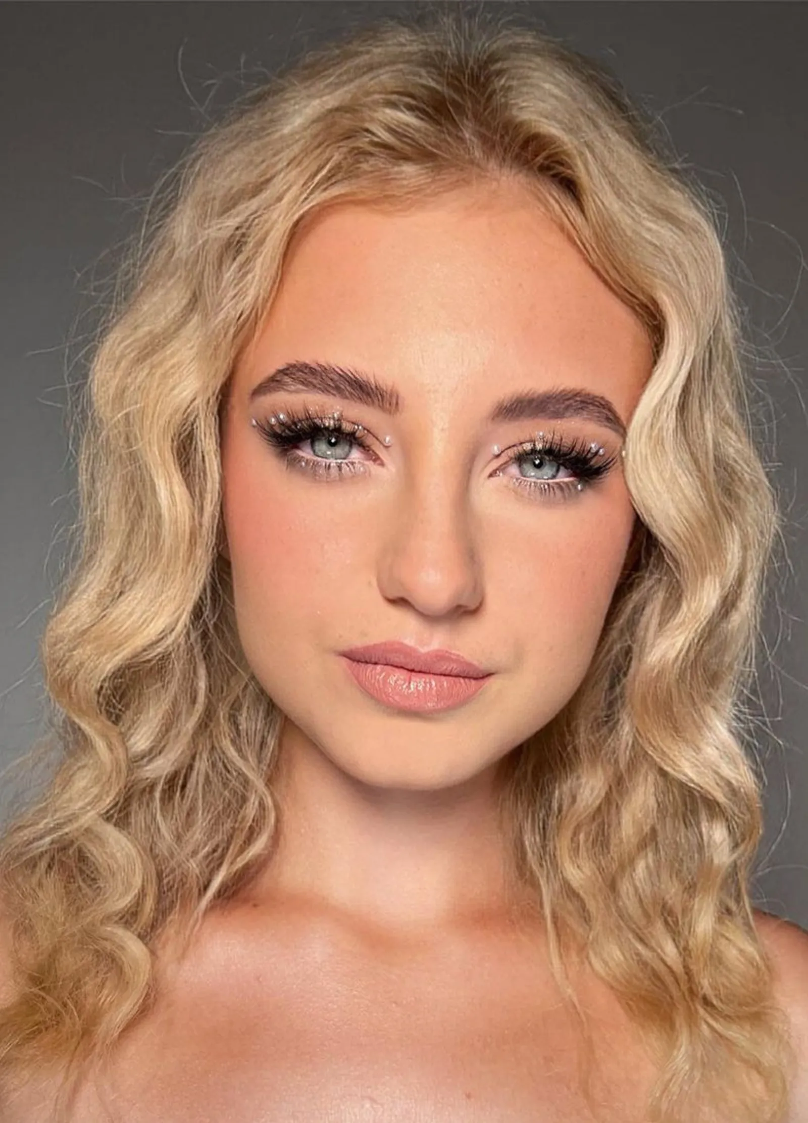 Para un resultado impactante, se recomienda usar sombras oscuras en las esquinas externas de los ojos, aplicando un poco de brillo nacarado en el centro del párpado móvil. Colocar mini perlas a lo largo del párpado.