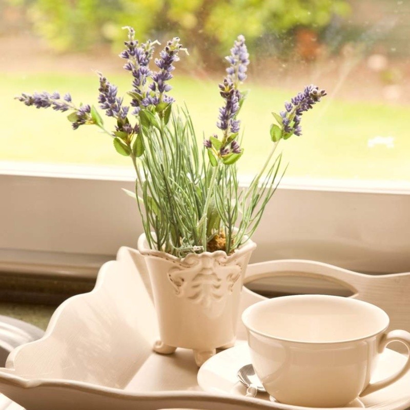 -Lavanda: Con sus racimos de pequeñas flores violetas, esta planta se encarga de desprender un suave y relajante aroma que contribuye con la prevención del estrés, además de ser un facilitador para la conciliación del sueño. Debe ubicarse en un sitio con luz directa por al menos 6 horas diarias y regarse sólo si la tierra está seca.