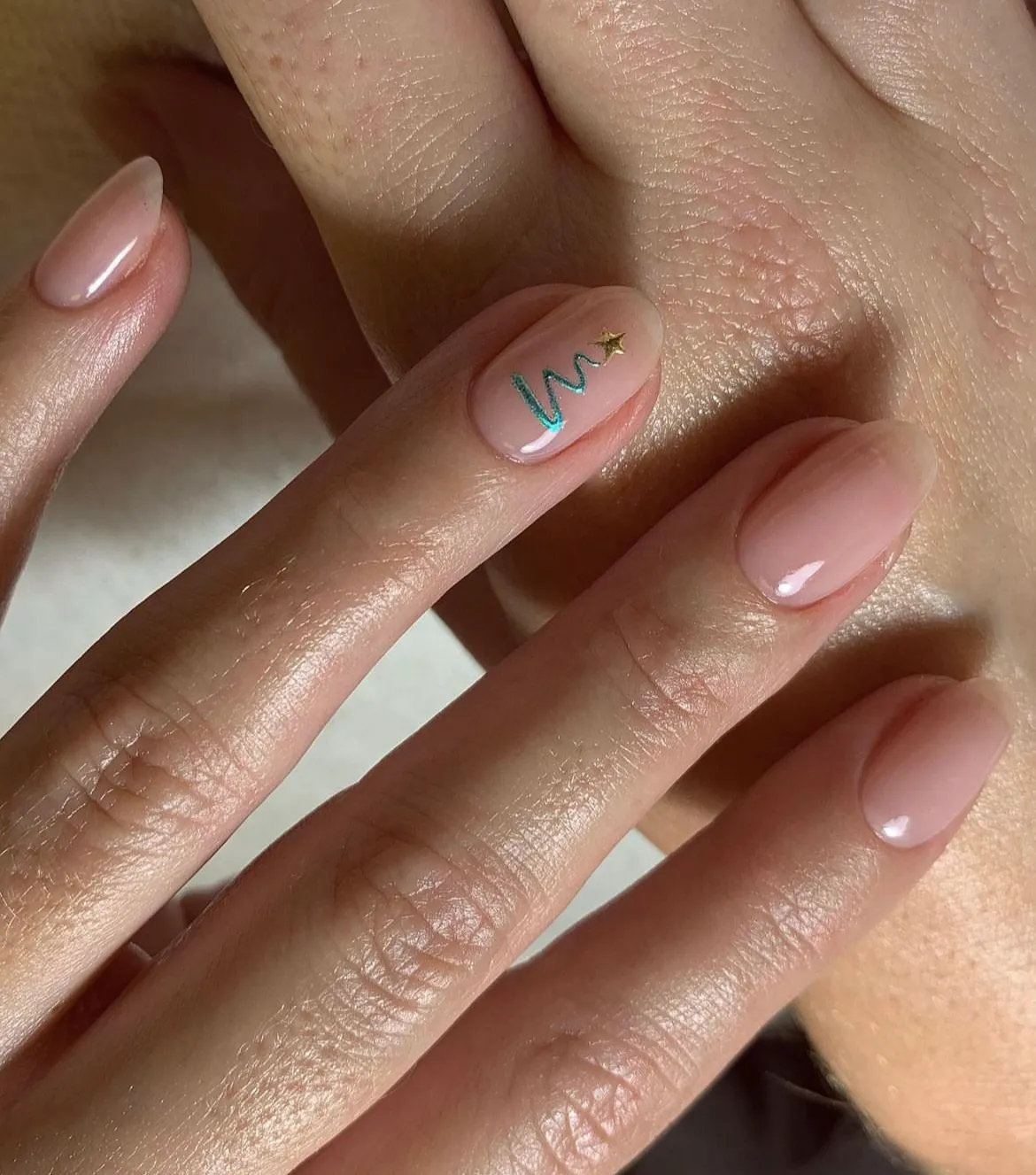 Una opción discreta y sutil, pero sin dejar de pensar en los detalles navideños. Con una base nude, se realizan líneas metálicas que den forma de árbol navideño y, para quienes se animen, pueden finalizar con una estrella dorada en la punta.