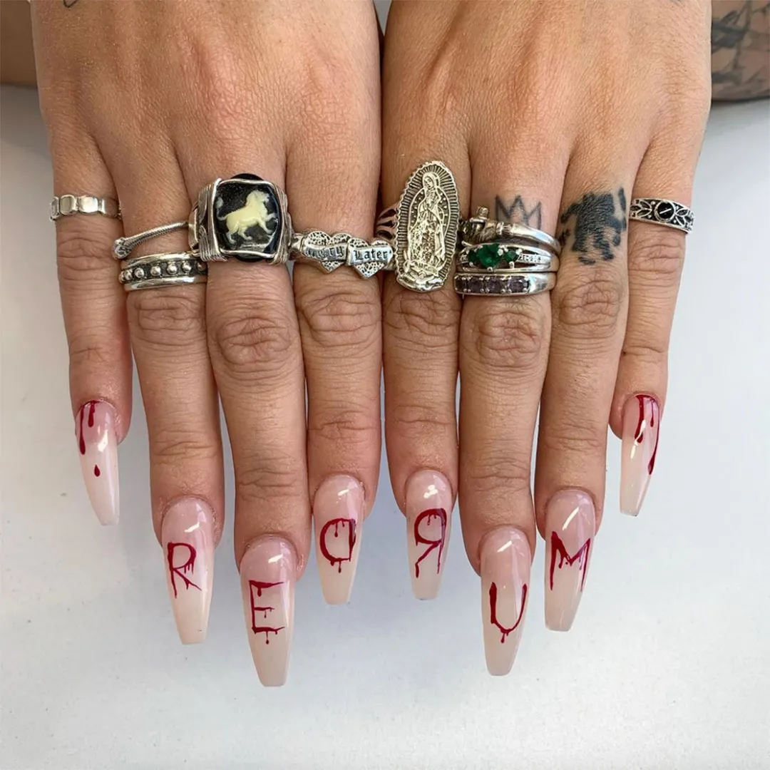 Finalmente, sobre una base transparente o nude, jugar con esmalte rojo "chorreado" que simule sangre y algunas palabras que hagan alusión al terror.