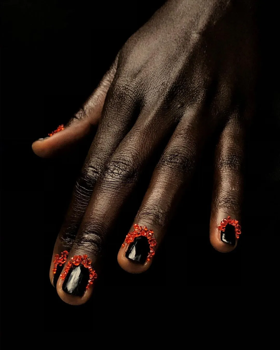 Una opción sencilla de hacer con cualquier largo y forma de uña. Las uñas completamente negras se acompañan por piedritas o apliques en naranja o rojo en la base de las mismas, combinando dos de los más emblemáticos colores de esta celebración.