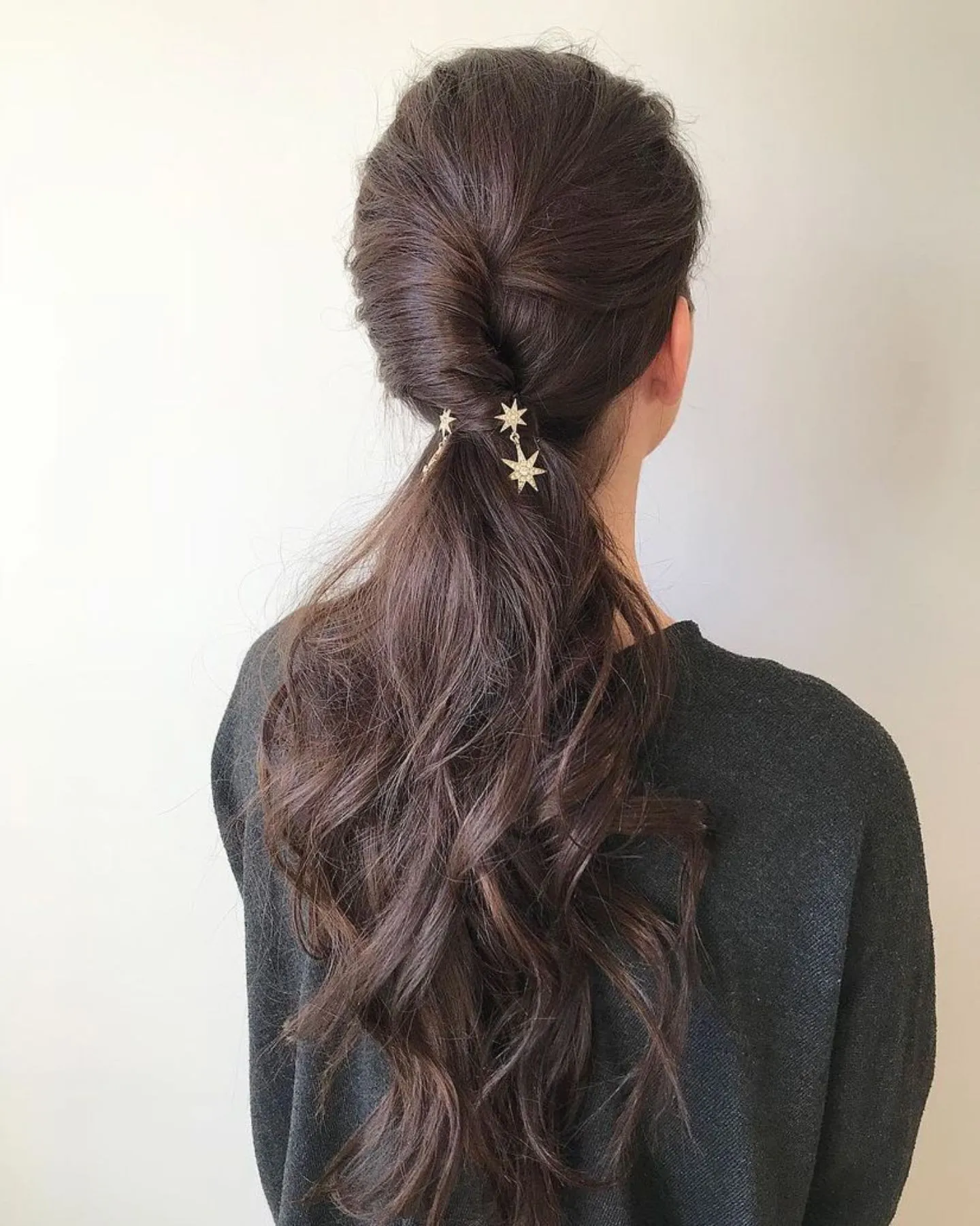 Se trata de la cola de caballo baja pero retorcida. Para lograrla, peinar el cabello hacia atrás y dividir en dos secciones. Enroscarlas en sí mismas y luego entrelazarlas. Sujetar con una colita e invisibles, y pequeñas hebillas o invisibles con detalles para decorar.