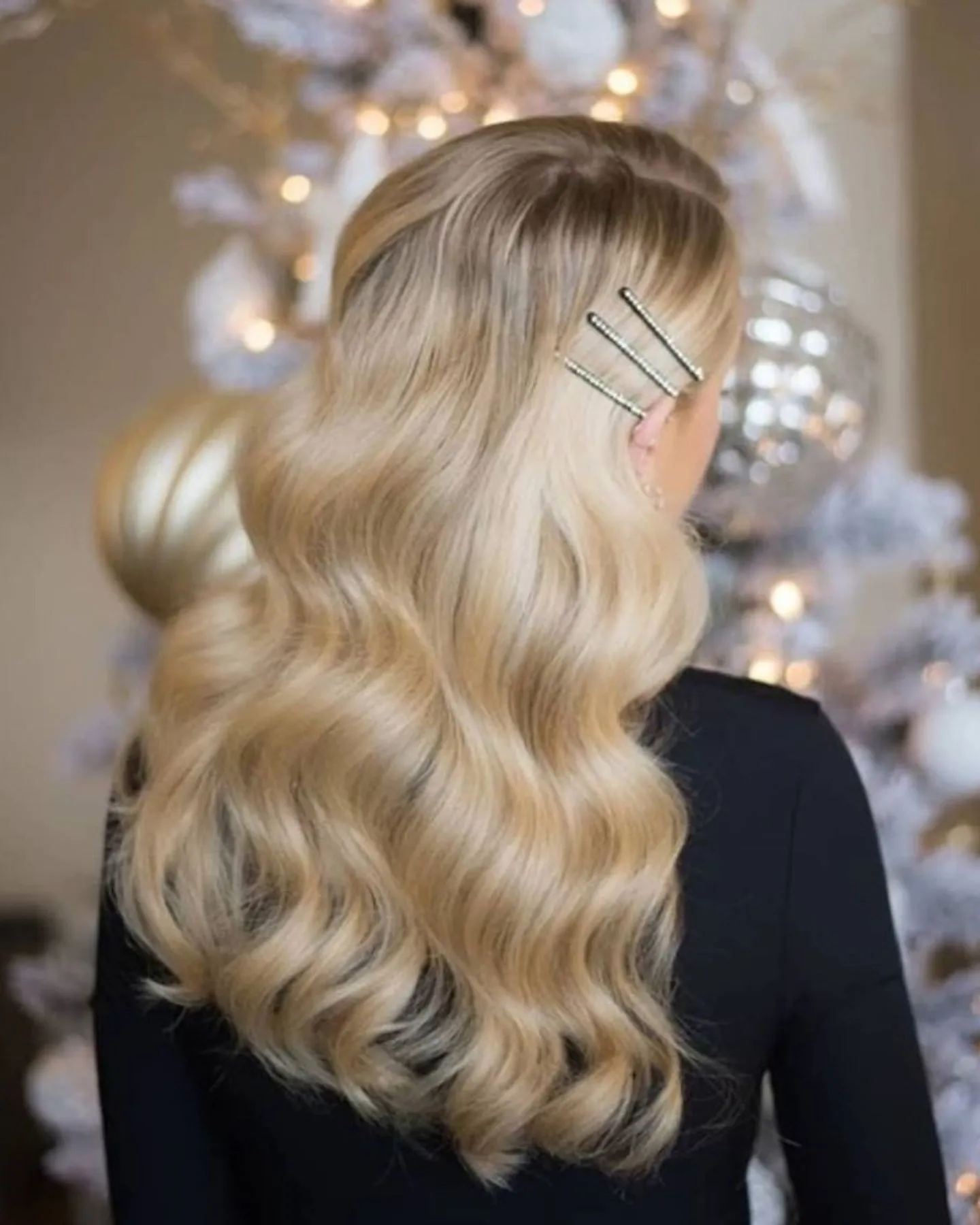 Para las amantes del pelo suelto, esta idea retro y glamorosa es ideal. Realizar ondas con una rizadora en todo el cabello, añadir un poco de spray y complementar con invisibles o hebillas con brillo.