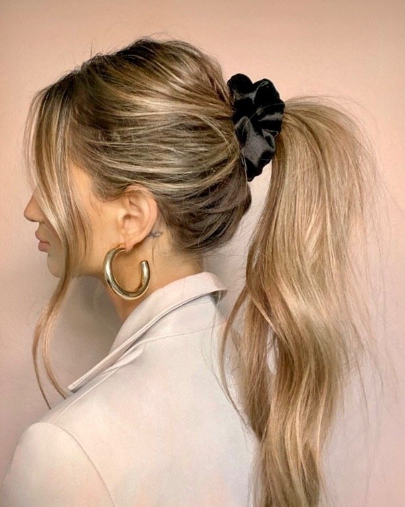 Una cola alta noventosa es ideal, sobre todo si se cuenta con las colitas anchas o scrunchies con detalles elegantes (por ejemplo, lucir una de terciopelo rojo o negro). Peinar todo el cabello hacia atrás dejando mechones sueltos en la parte de adelante. El cabello se sujeta alto con la scrunchie. Puede complementarse con aros grandes que se lucirán a la perfección.