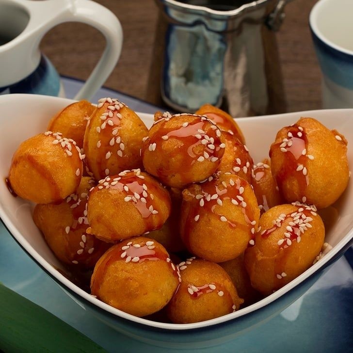 Preparación: Mezclar los ingredientes secos y agregar el agua hasta conseguir una masa blanda. Dejar desacansar por al menos una hora. Armar bolitas pequeñas (tener en cuenta que crecen al cocinarse), y freir en aceite caliente a temperatura media hasta dorar. Incorporar al jarabe frío, removerlo allí y dejar unos minutos hasta que absorban algo del mismo. Servir.