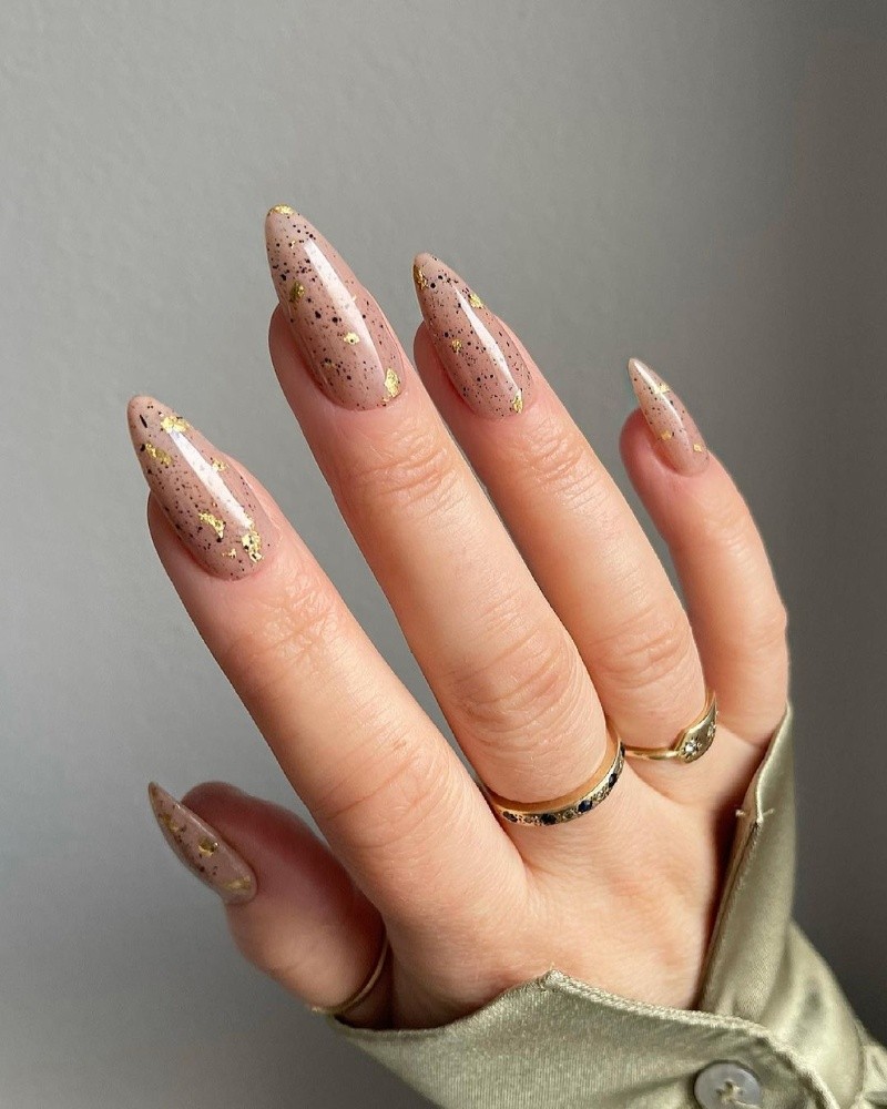 El acabado tipo granito es ideal para quienes deseen lucir una especie de piedra natural en sus uñas. Con base neutra, se realizan distintos puntos y líneas descontracturadas entremezclando negro y dorado, para luego finalizar con una capa de brillo.