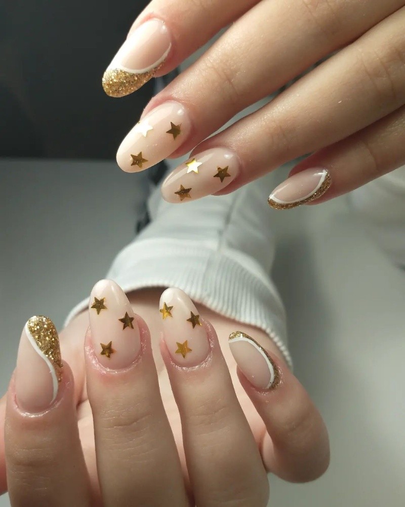 Con base transparente, las figuras de estrellas doradas suelen quedar sumamente delicadas y acompañar muy bien cualquier outfit. Pueden intercalarse algunas uñas con estrellas y otras con otros diseños.