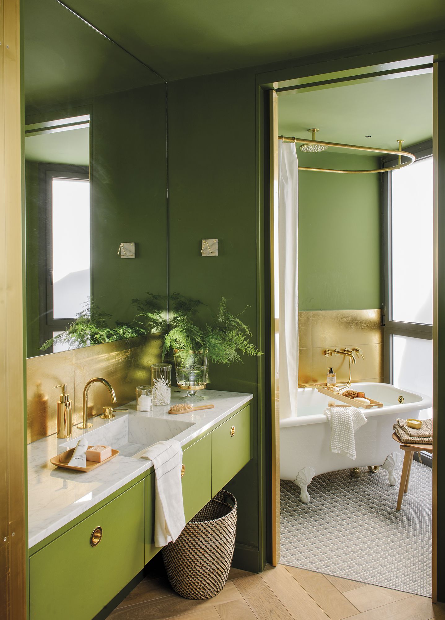 En este caso se recomienda hacer una especie de "total look" variando las intensidades y tonalidades. El verde es uno de los colores favoritos para relajarse, pero debe elegirse de forma adecuada, por eso se recomiendan distintos tonos para pared y muebles. A su vez, sumar materiales como el mármol y detalles en color dorado, darán un toque más elegante.