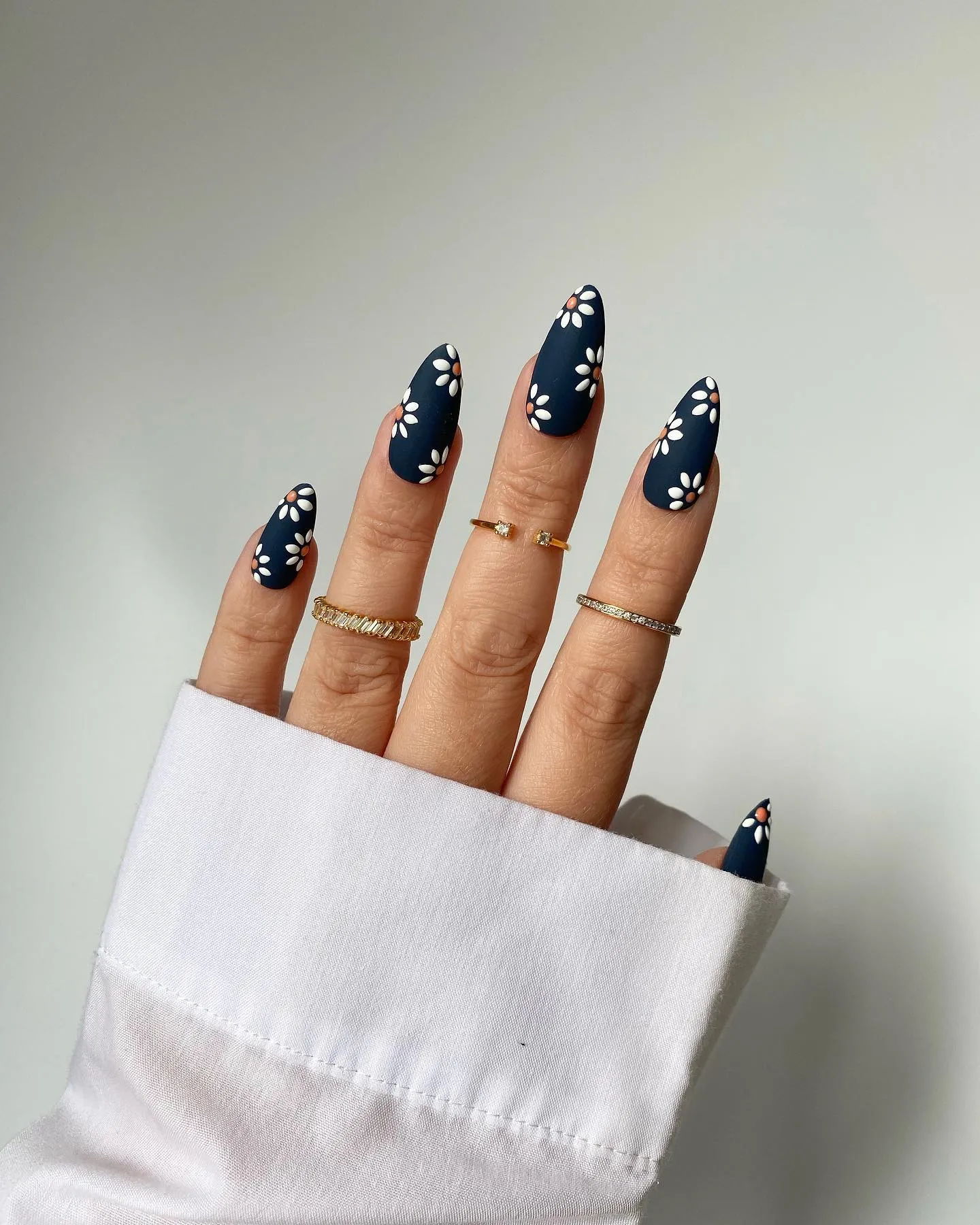 -Oscuras y mate: Para quienes desean lucir un diseño que se aleje de los colores pasteles o claros, se puede usar una base oscura y profunda como el azul marino, verde bosque, borgoña e incluso negro. Posteriormente, dibujar las margaritas y finalizar con top coat mate.