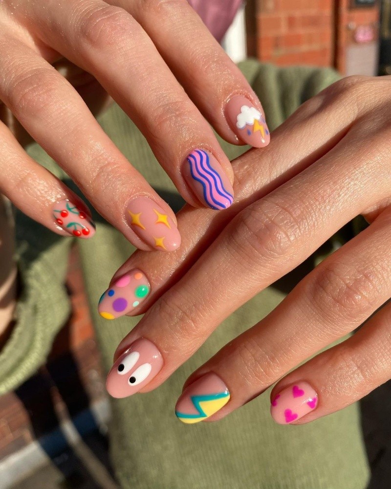 Cada uña debe lucir un "print" distinto, en donde se entremezclen colores, formas, patrones y diseños según el outfit que se luzca o indistinto al mismo. Las opciones son diversas: base nude con dibujos sobre la misma, base de color con prints, y la combinación de colores también es muy variable. Ojos, líneas, estampas de animales, brillos, corazones y puntos son algunos de los favoritos.