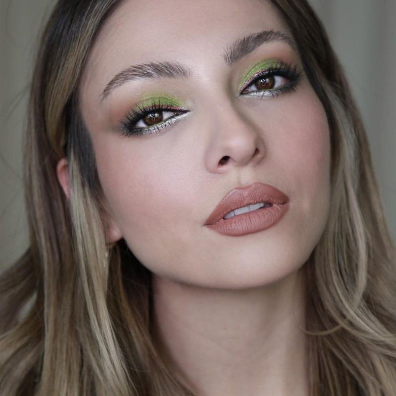 El clásico verde estilo "Grinch", bien navideño, puede aplicarse en combinación con colores metálicos para un delineado sutil, a la vez que sombras en tonos café y tostado. Se puede anexar la definición del ángulo del lagrimal con delineador negro para una mirada más impactante.