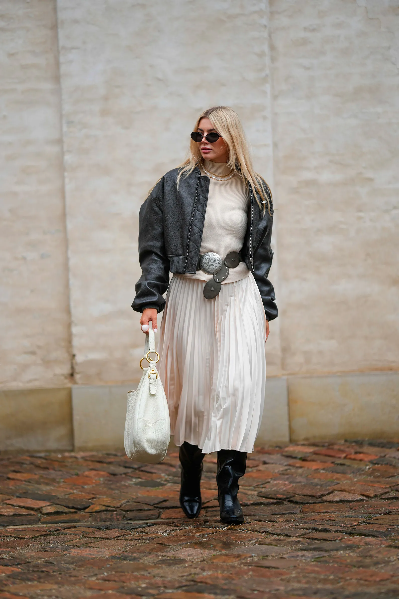 -Plisados: Las prendas plisadas son un verdadero must, sobre todo a partir de instalarse el estilo office siren antes mencionado. Los lazos y pliegues se entremezclan en prendas como faldas midi, mini o incluso largas pero con este detalle en su tela. Las botas de cuero son las principales aliadas para un outfit muy a la moda.