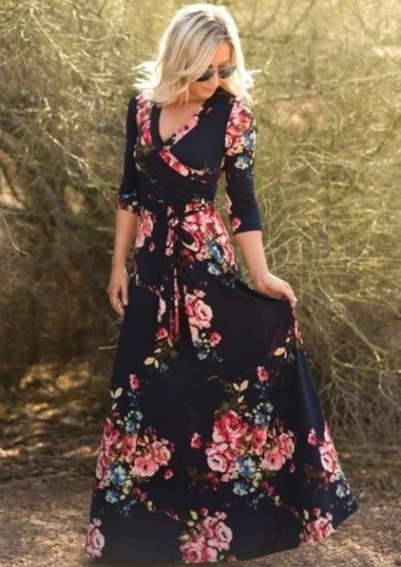 -El maxi dress floral de noche: una reinterpretación del clásico estampado primaveral, pero con base oscura. Perfecto para quienes buscan un estilo romántico con un toque moderno, ideal para combinar con sandalias delicadas o tacones minimalistas.
