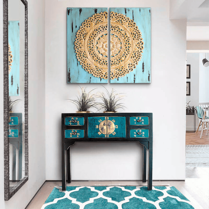 -Cuadro único: Si se cuenta con un mueble, puede colocarse un cuadro grande sobre el mismo aprovechando su superficie. Incluso pueden ser dos, o una misma obra separada en diferentes cuadros.