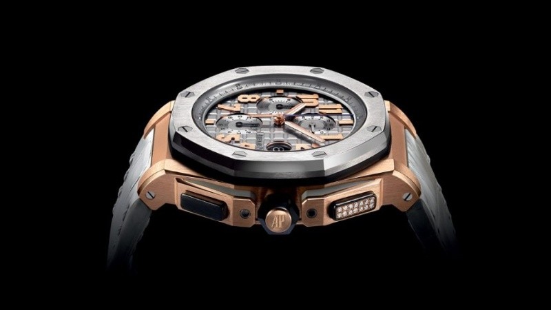 El modelo cuenta con una estructura de oro rosa, cerámica y titanio tanto en su esfera como en la caja y la pulsera de este diseño gris y rose gold. A su vez, posee un bisel de titanio y coronas que sobresalen del dispositivo.