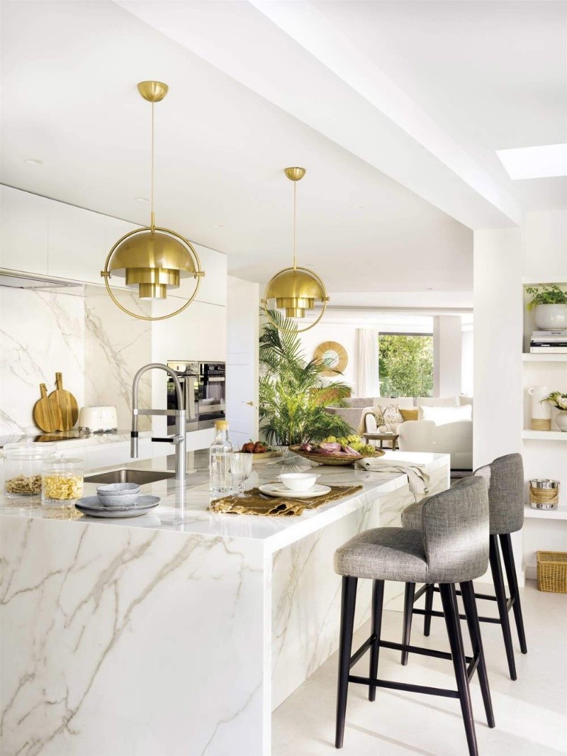 -Acabados brillantes: Un material como el Neolith Calacatta con acabado brillante es ideal para revestir paredes o una isla, ya que se trata de una piedra que imita el mármol añadiendo decorativas vetas que cortan con la frialdad. Además, las lámparas generales pueden ser de algún color metalizado como el dorado, que además de estilo brinda gran calidez.