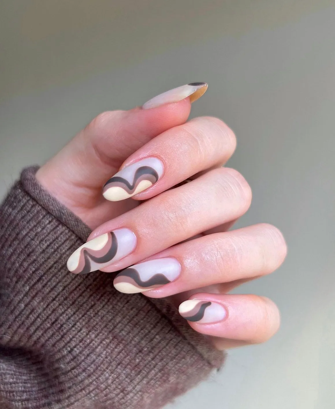 Desde tiras hasta líneas fluídas podrán dibujarse para emular una especie de chocolate derretido. Para ello se recomienda utilizar una base transparente y, sobre la misma, dibujar estas tiras en distintos tonos café o chocolate. Ideal para uñas con punta stiletto o almendradas.