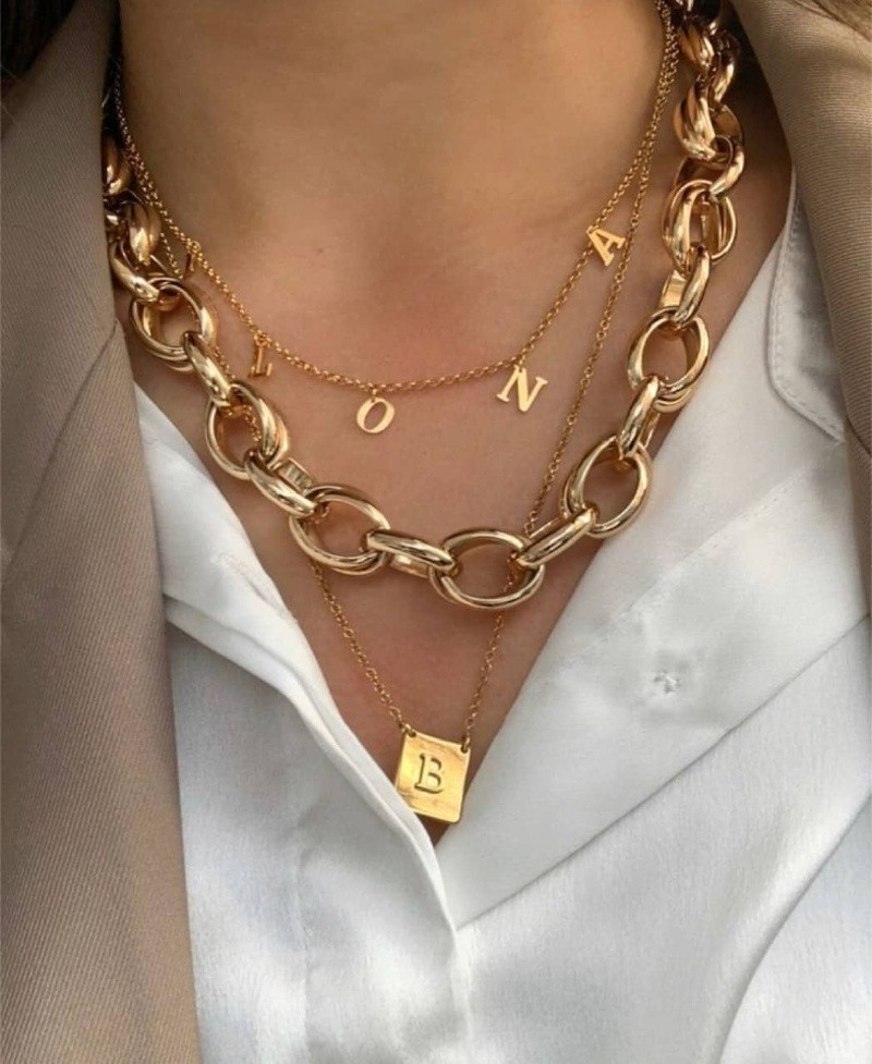 - Cadenas XL: Las cadenas gruesas serán de las más elegidas en este 2021. Una buena opción es combinarlas con una o dos cadenas más finas, según el toque que se le quiera dar al look final.