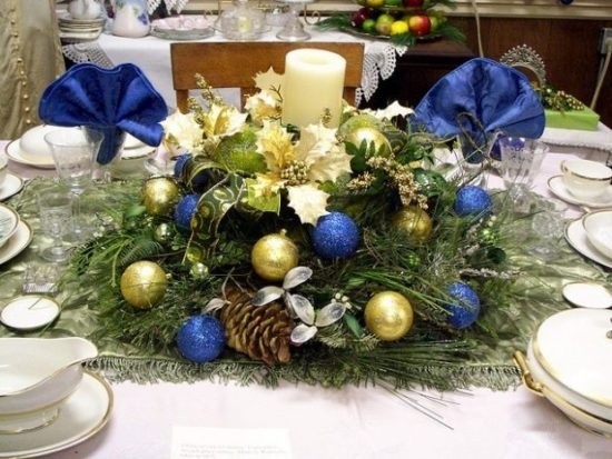 - Centros de mesa más amplios: Queda muy bien si la celebración se realiza al aire libre. Algunas de las hojas y ramas pueden pintarse con dorado, azul o verde. Botellas antiguas, copas y vasos junto con velas, son algunos de los objetos que pueden combinarse con hojas, ramas, piñas, frutos secos y otros elementos acordes a las fiestas.