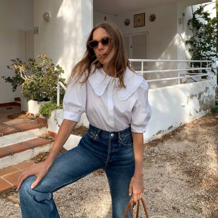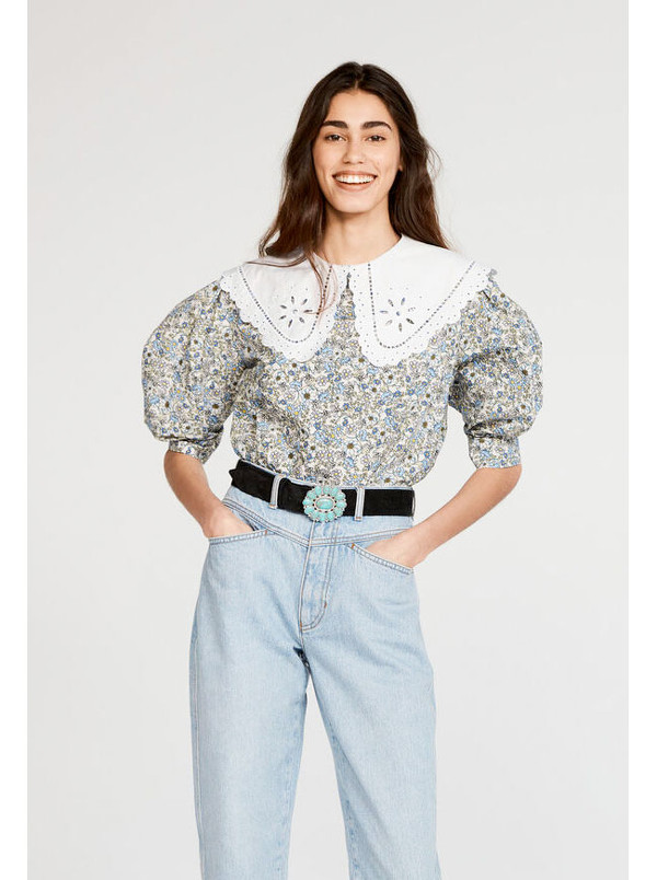 Al igual que las terminaciones que recuerdan a los delantales o guardapolvos escolares, este estilo de cuello se suma en este caso a una camisa mangas cortas tipo globo, ideal para usar con un jean.
