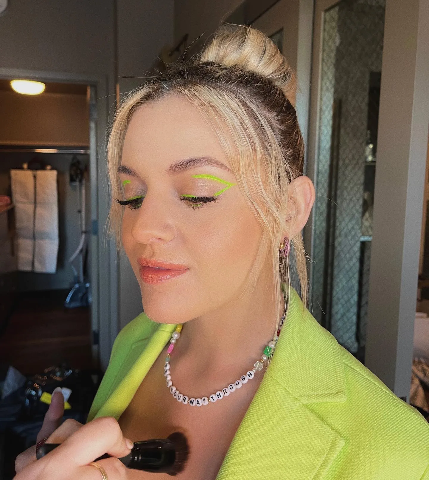 -Total look verde limón: Otra gran idea del make up es combinarlo con el resto del outfit. Por ejemplo, usar un atuendo en verde lima y, en los ojos, un delineador del mismo tono. Realizar una línea delgada en la cuenca que se extienda hacia afuera para marcar la V externa.