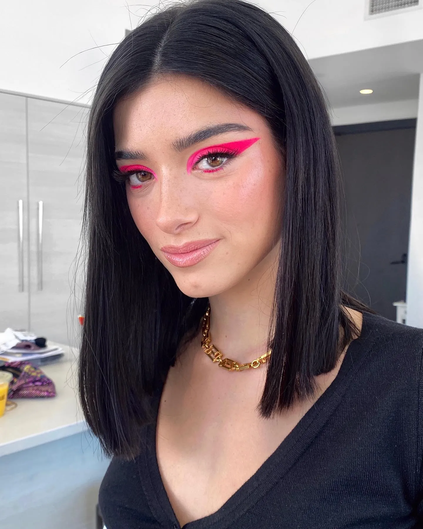 -Rosa neón: Los tonos púrpura, magenta, rosa o morado son ideales para resaltar los ojos marrones. Se recomienda usar un delineador intenso y dibujar una línea gruesa que siga la curva natural del párpado superior, extendiéndolo hacia las sienes. Alargar el trazo de la esquina exterior y unirlo para más drama. Rellenar el párpado móvil y aplicar máscara de pestañas para finalizar.