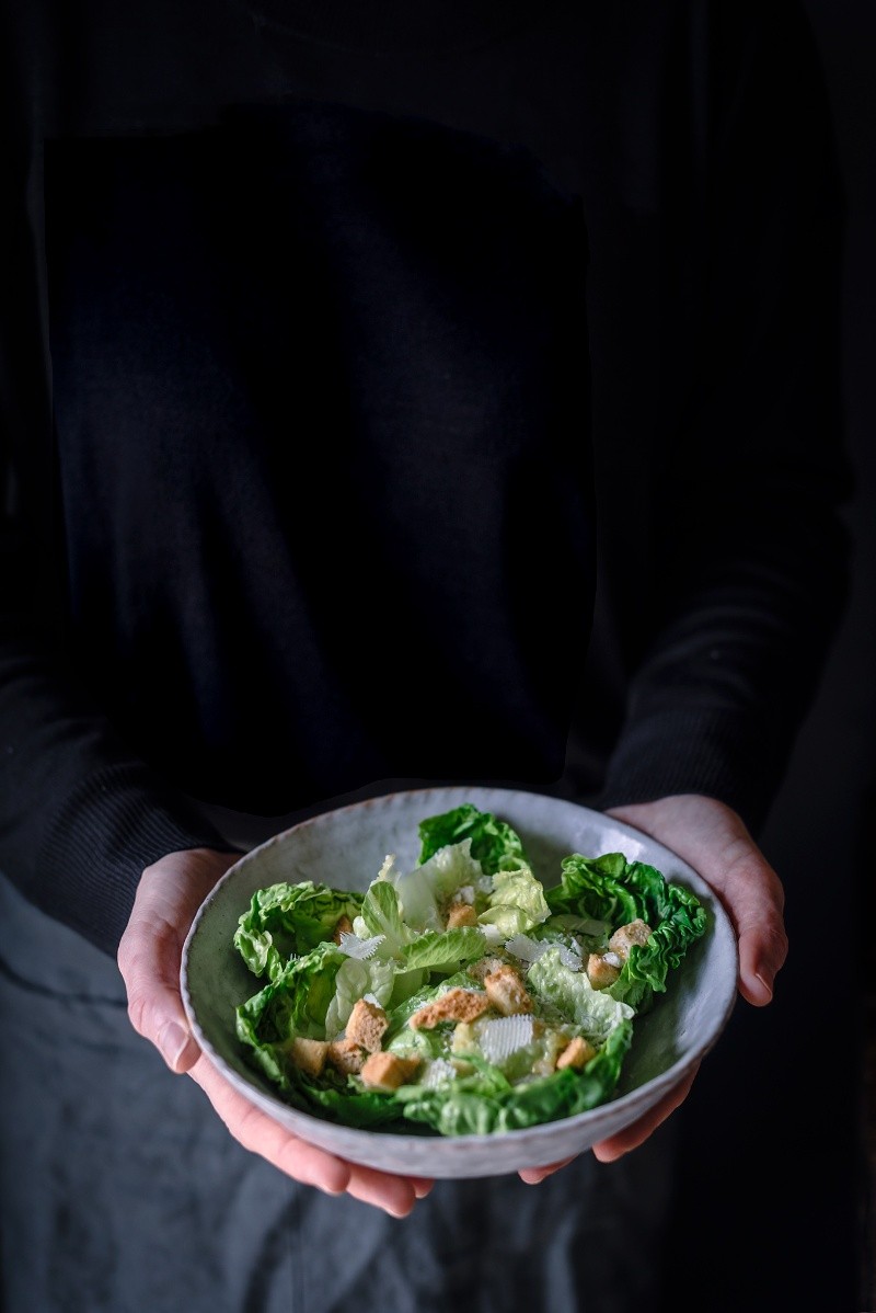 Ingredientes (para 4 porciones): 2 lechugas romanas o cos; 1 limón; 2 anchoas; pan con mucha miga (en lo posible de un día anterior); medio ajo pelado; 1 cucharadita de salsa Worchesterchire; 1 cucharadita de mostaza de Dijón; 1 yema de huevo; 175 ml de aceite de oliva; 50 gramos de queso parmesano; sal y pimienta a gusto.