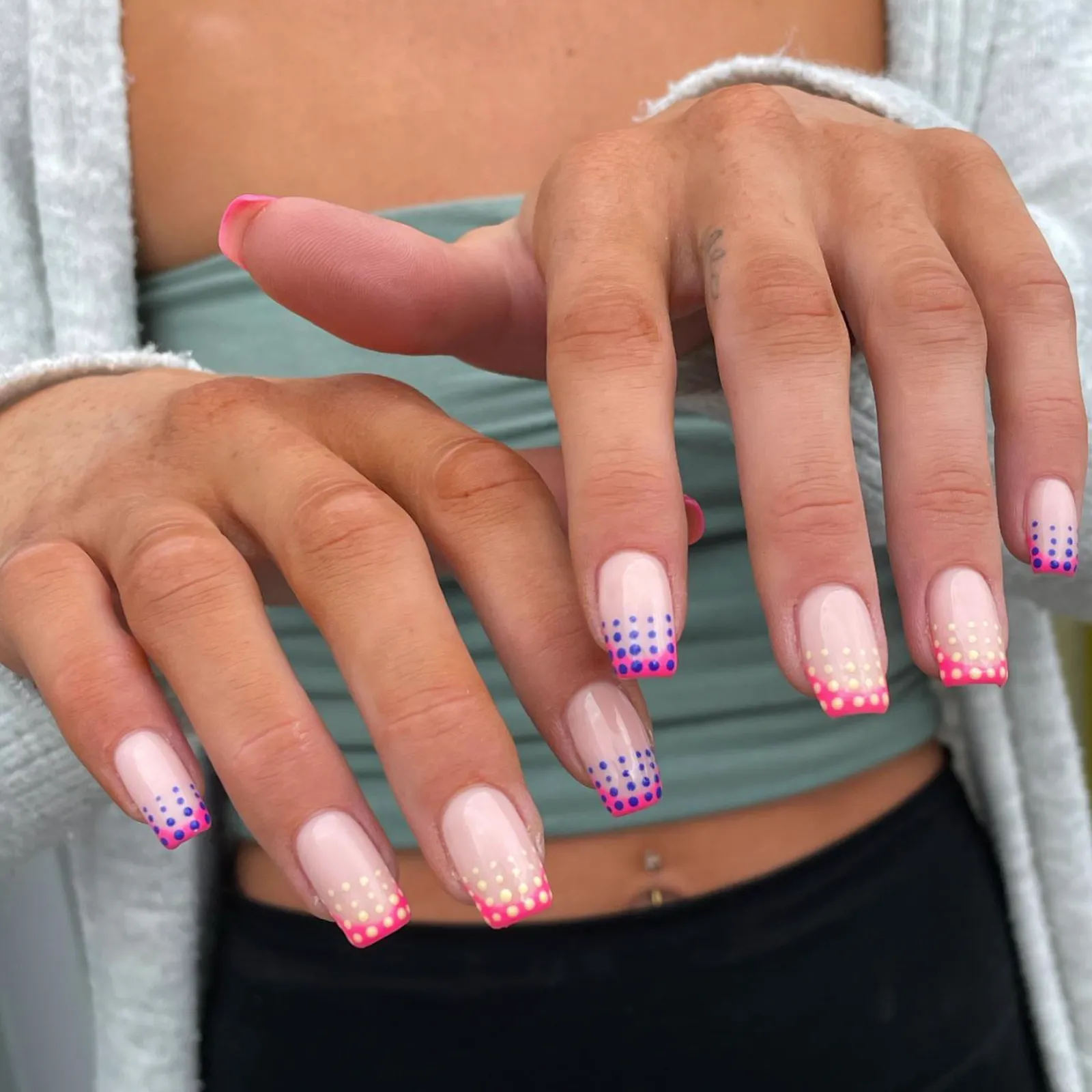 A la clásica punta -que puede realizarse en blanco u otro color-, se le añaden una serie de puntitos que llegan hasta la mitad de la uña. Para realizar los mismos se recomienda usar un palillo de madera, garantizando que cada punto sea pequeño y delicado.