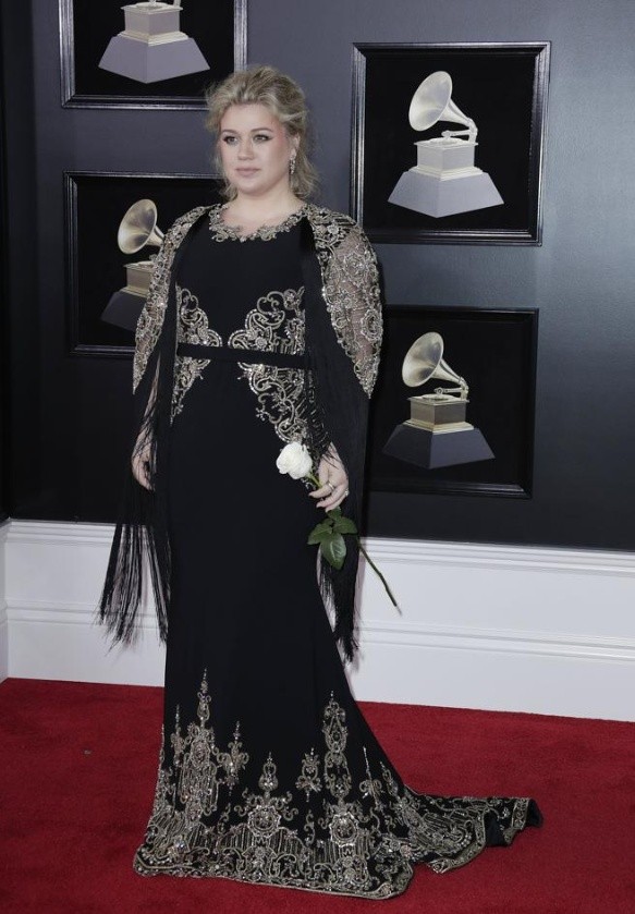 Kelly Clarkson ha llevado un difícil vestido negro de Christian Siriano, con bordados dorados en las mangas, cuerpo y bajos del diseño, que también tenía flecos.