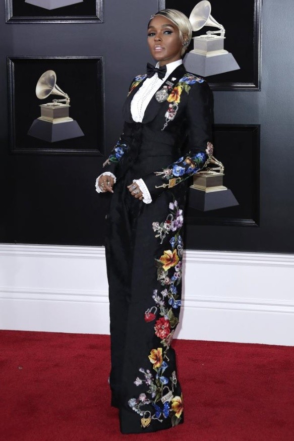 Janelle Monae, fiel a su estilo, ha llevado un esmoquin de Dolce & Gabbana con unas coloridas flores pintadas a mano.