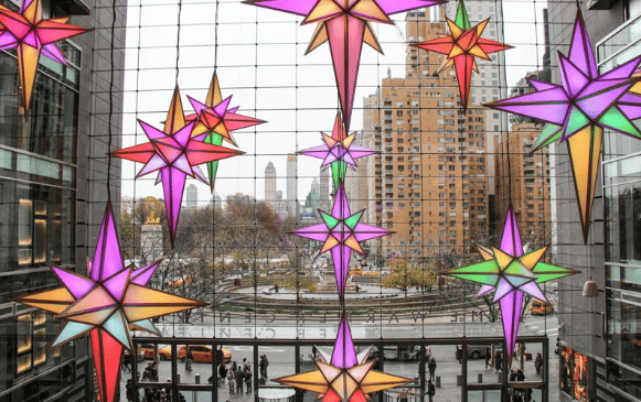 En la esquina suroeste de Central Park, instala todos los años estas estrellas gigantes que van cambiando de color.