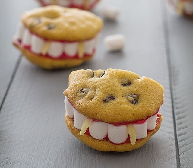 Hornear 8 minutos y dejar enfriar. Luego pasar a la decoración. Para la misma se teñirá la crema pastelera o crema de avellanas con colorante rojo (ir agregando y mezclando hasta obtener el color deseado para recrear una encía). Cortar las galletas por la mitad y untar cada mitad con esta crema teñida. Colocar los malvaviscos como si fuesen dientes y unir ambas tapas. Colocar las almendras fileteadas a modo de pequeños colmillos.