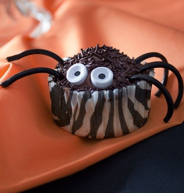 Rellenar los moldes (3/4 de molde porque se elevarán). Hornear 20 minutos o hasta que, al pinchar con un palillo, el mismo salga seco. Retirar y dejar enfriar sobre rejilla. Una vez que se enfríen, decorar: Untar con crema de avellanas y cacao por la superficie, y crear las arañas. En este caso, los ojos se realizaron con caramelos cuya pupila se dibujó con rotulador comestible, y las patas son caramelos tipo regaliz cortados en pedazos de aproximadamente 4 centímetros.