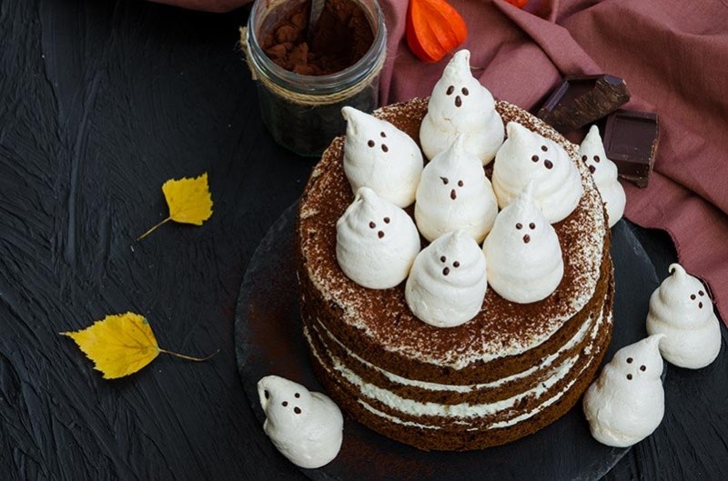 Para decorar, colocar en la superficie una mezcla entre cacao en polvo y azúcar impalpable, y agregar fantasmitas de crema chantilly o merengue. Con chocolate fundido, dibujarles caritas con la ayuda de un palito.