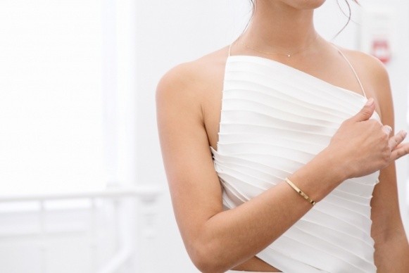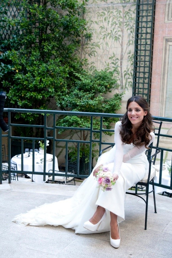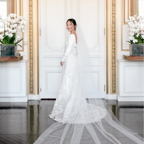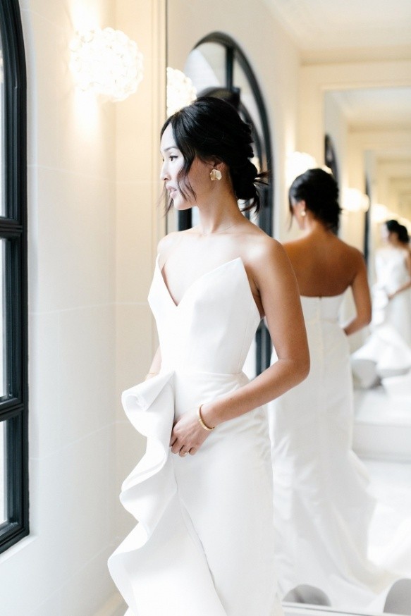 La influencer detrás del blog Eat Sleep Wear se casó en febrero de 2016 con un original vestido de Vera Wang, caracterizado por un escote palabra de honor asimétrico con cuerpo de mikado de seda y original falda de organza. El toque chic al look fue un velo mínimo de redecilla.