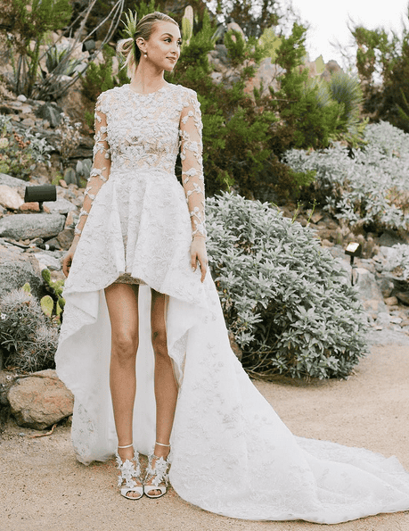 La influencer y diseñadora Whitney Port reconoce que decidirse por un vestido de novia fue una tarea titánica en la que encontró un aliado inesperado: Pinterest. El diseñador elegido fue el libanés Ashi, que creó para ella un vestido que da todo el protagonismo al encaje y las transparencias en el cuerpo, mientras que la falda destaca por ser muy corta por delante y caer en la parte posterior formando una cola.