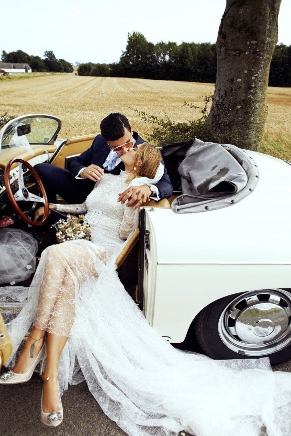 Pernille Teisbæk se casó el verano pasado con su novio Philip Lotko en su Dinamarca natal. Eligió un diseño de Vera Wang cuya característica principal eran las transparencias y las perlas bordadas a lo largo de todo el diseño. Lo complementó con un velo largo y zapatos de Manolo Blahnik.