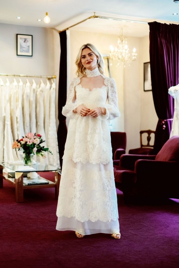 Fue en abril de 2016 cuando Pandora Skyes se casó con su pareja, Ollie Tritton, en la casa de sus padres en Essex (Reino Unido). Eligió para la ocasión un diseño de su amiga Alice Temperley, de Temperley London. Un vestido en el que destaca el encaje para construir un modelo presidido por el romanticismo, con falda de paneles, manga larga, cuello alto y espalda abierta.