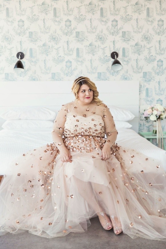 Nicolette Mason es una de las bloggers plus size más populares del mundo, y para diseñar su vestido de novia acudió a Christian Siriano, uno de los diseñadores más reconocidos por sus creaciones para mujeres de todas las tallas. Él creó un vestido específicamente para ella, de chiffon en color maquillaje, con mangas transparentes y aplicaciones florales en dorado.