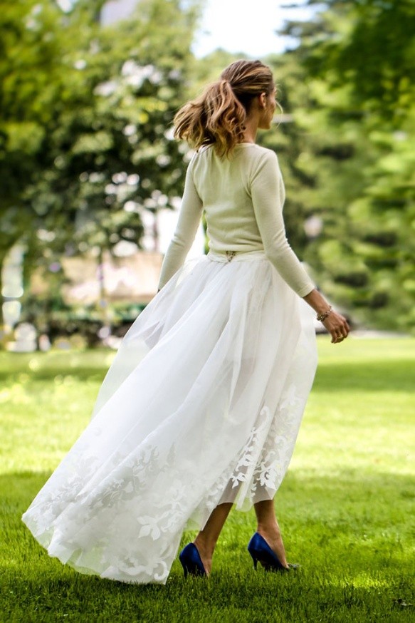 ¿Quién no recuerda el outfit nupcial de Olivia Palermo? La sencillez y la sofisticación nunca se entendieron mejor que aquel día de junio de 2014 en que contrajo matrimonio con Johannes Huebl. Un vestido blanco, largo por detrás, corto por delante, con unos shorts bajo la falda, de Carolina Herrera, que combinó con unos zapatos azul noche de Manolo Blahnik.