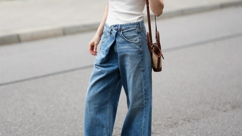 -Con básicos al cuerpo: Remeras lisas, tops ajustados o poleras son grandes aliados para equilibrar el volumen del jean y resaltar el detalle cruzado.