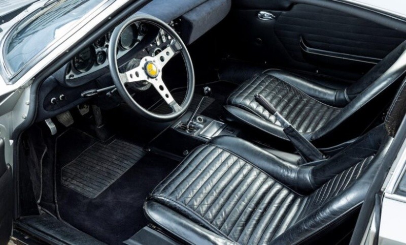 Con número de chasis 03354, la Dino 246 GT conserva sus colores de carrocería e interior originales. El exterior cuenta con un plateado denominado "Argento Metallizzato" y, por dentro, su cuero está teñido de un negro "Nero Connoly".