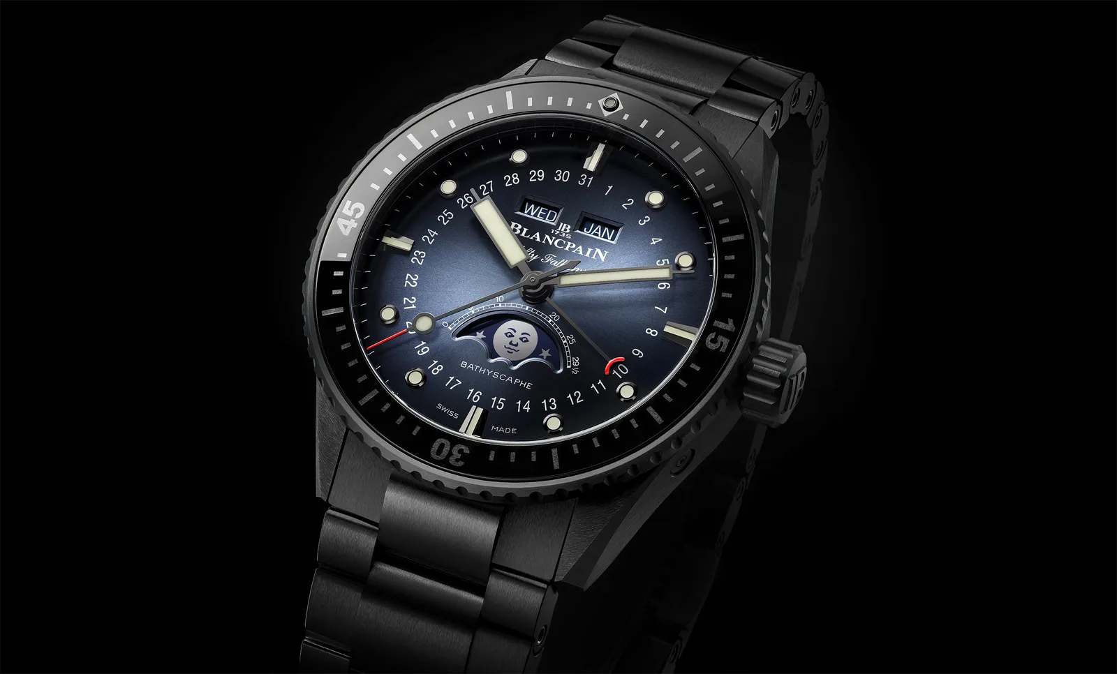 Una nueva pieza de la relojería de lujo se anima a combinar la cerámica negra de alta tecnología con una esfera vibrante que captura la luz de manera única pudiendo verse en azul, verde o negro. El reloj en cuestión es el Bathyscaphe Quantième Complet Phases de Lune, de Blancpain.