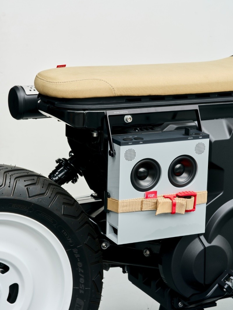 El resto de modificaciones se centra en lo estético, como la barra amarilla en "U" para reforzar el guardabarros delantero, apoyapiés con cinta adherente de monopatín y un parlante Bluetooth OB-4 Magic Radio fijado al cuadro con un soporte y correa beige. En cuanto a su funcionamiento, la BMW CE 02 x Vagabund cuenta con un motor eléctrico original de 15 CV y dos baterías de 1,96 kWh.