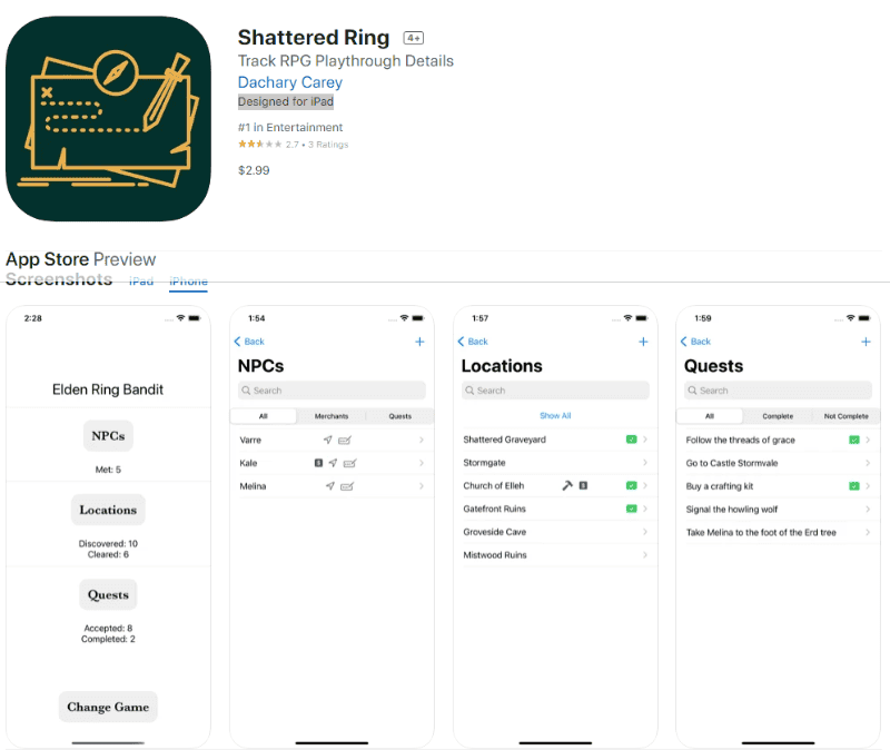 Sin embargo y como era de esperarse, un fan creó Shattered Ring, una app que permite mantener un real seguimiento de elementos, misiones y personajes. Fue creada por Dachary Carey y ofrece una base de datos para completar con nombres de NCP, locaciones, misiones, agregar notas, lo que la hace apta para usarse en cualquier juego de rol.