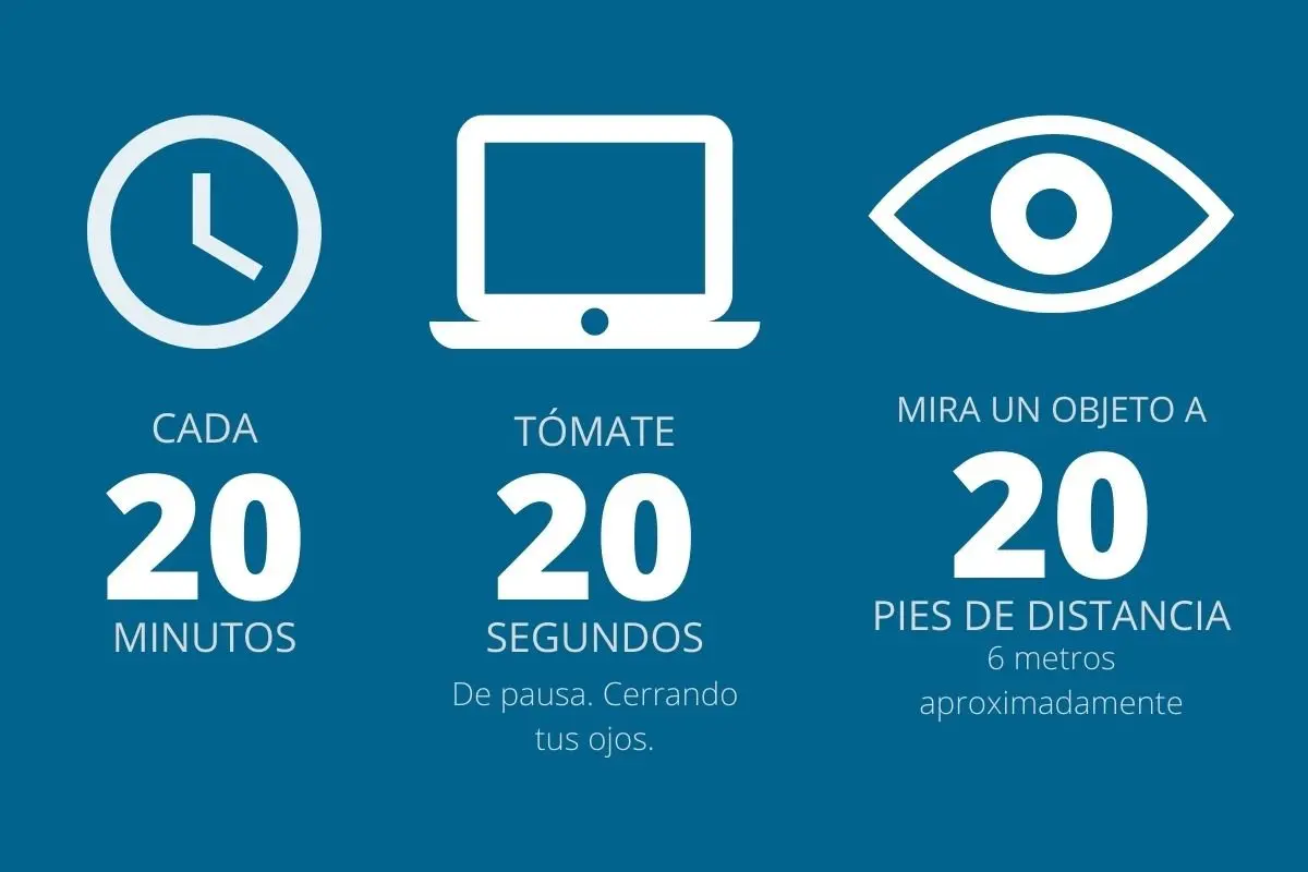 -Tomar un descanso de 20 segundos apartando la vista, haciendo el ejercicio de observar con atención algo que se encuentre a 6 metros de distancia (o 20 pies). Este ejercicio se puede intercalar con la opción de pararse, caminar unos pasos, estirarse, hacer ejercicios de respiración, entre otras alternativas de distracción y movimiento.