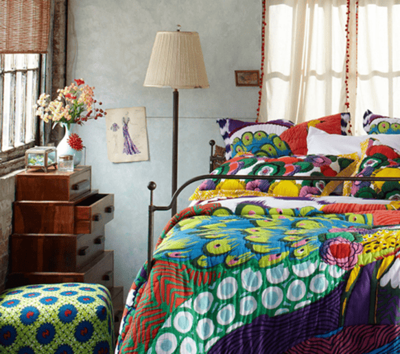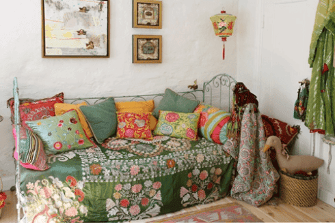 Los colores son precisamente el eje sobre el cual gira todo lo que está relacionado con el Boho Chic. Aparecen muchos y todos ellos mezclados con naturalidad en cualquier ambiente, ya sea un salón o un dormitorio. No hay decoración Boho Chic que valga si no hay una fuerte presencia de colores vibrantes y aterciopelados, alegres y bohemios que contrasten los unos con los otros. Están permitidos los fucsias, morados, naranjas, amarillos mostaza, azules profundos.