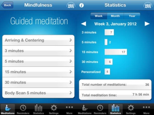 Esta aplicación de muy fácil uso y sencilla interfaz, viene con más de 17 temas que varían desde el sonido del mar, hasta el rumor nocturno en una isla. Se puede programar el tiempo de meditación y también, permite personalizarla al mezclar los distintos sonidos. Por ejemplo: el de la hoguera con el de la lluvia en el bosque.