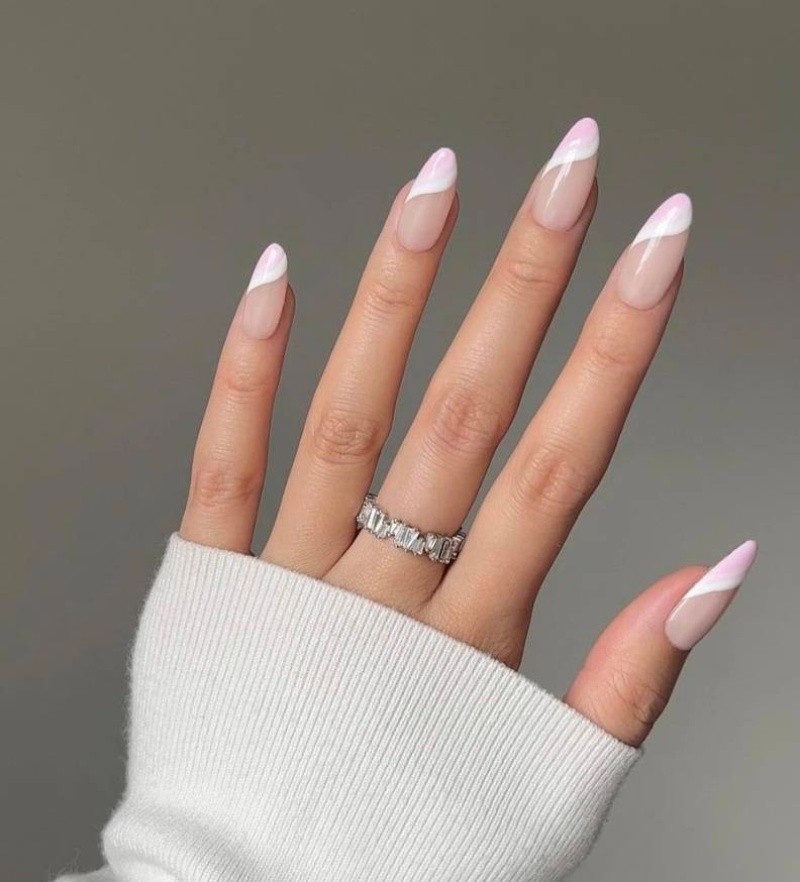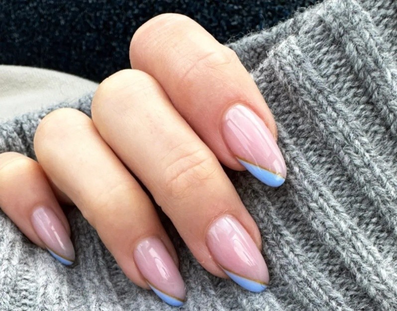 Uno de los ejemplos lo lució recientemente Lilly Collins, la actriz protagonista de Emily in Paris. La joven estrella optó por llevar uñas ovaladas con base transparente en rosa pálido (una base similar a la que se suele usar en las francesitas tradicionales). Para brindar un detalle especial, se realizó una pequeña línea en diagonal en un celeste pastel junto a una delgada línea dorada para dar un toque de brillo extra.